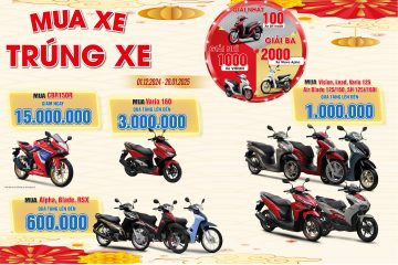 MUA XE – TRÚNG XE Từ ngày 01/12/2024 đến 28/01/2025 Khách hàng có cơ hội MUA XE TRÚNG XE: 𝟏𝟎𝟎 Giải đặc biệt: Xe SH mode 𝟏.𝟎𝟎𝟎 Giải nhất: Xe Vision 𝟐.𝟎𝟎𝟎 Giải nhì: Xe Wave Alpha Nếu như không trúng?? Mua: Wave Alpha/Blade/Wave RSX nhận [...]